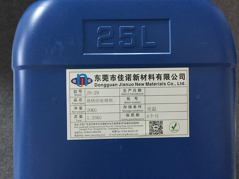 JN-29应用于硅胶制品和各种图案的热转印处理剂,此处理剂直接喷涂于硅胶表面,不需要表面处理(火焰或者放电),也不需要烘烤,具有表干速度快,转印后附著力好,好剥离保护膜。